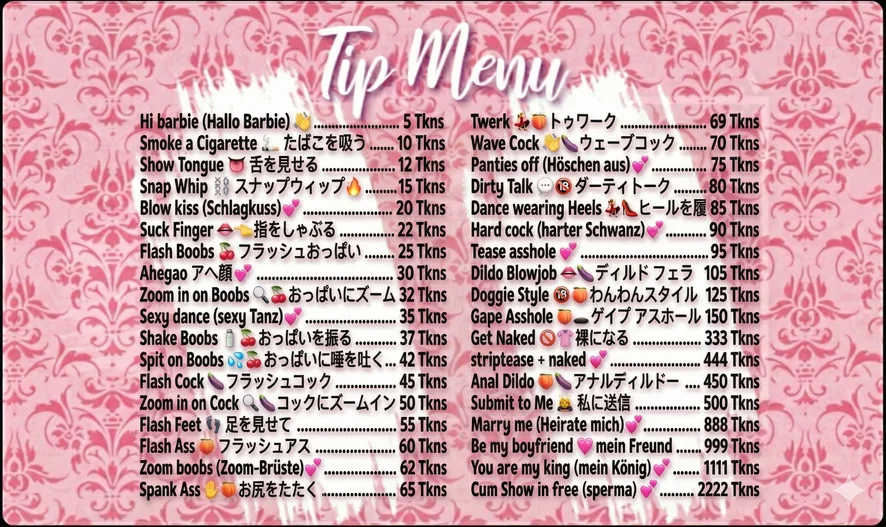Masturbation, Hardcore, Footjob, Doigtage, Glory Hole, Ahegao, Sexe anal, Sextoys anaux, Fellation, Cosplay, Cocu, Giclées de sperme, Gorge profonde, Doggy style, Strip-tease, Tittyfuck, Fumeurs, Masturbation guidée, Talons, Dance érotique, Twerk, Avale, Éjaculation féminine, Fessée, Sextoys, Jeux de rôles, Liquide pré-séminal, Orgasme, Fétichisme des pieds, Éjaculation, Gode ou vibromasseur, Jeu de sperme, Dirty Talk, Évaluation de bites, Du cul à la bouche